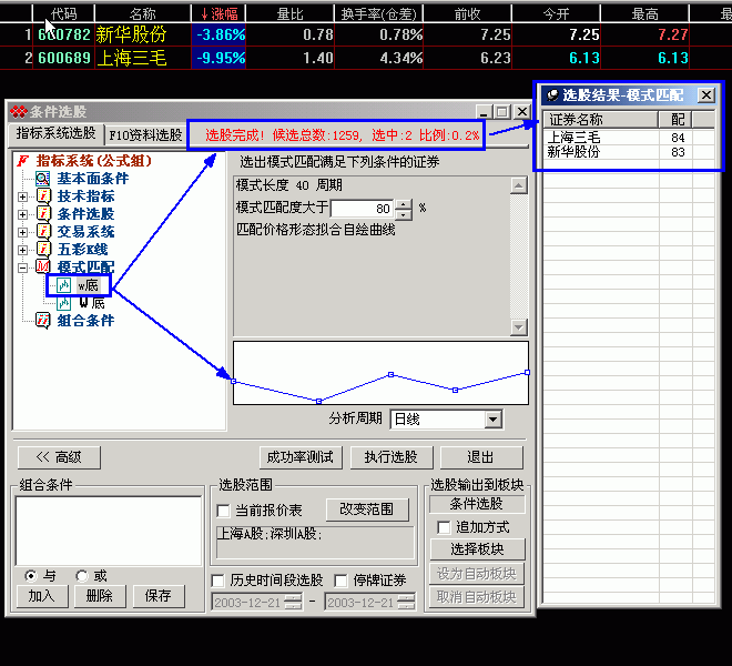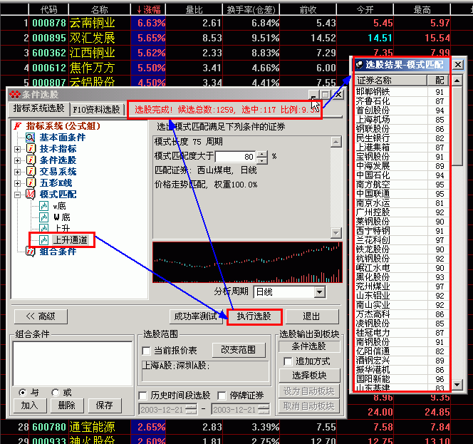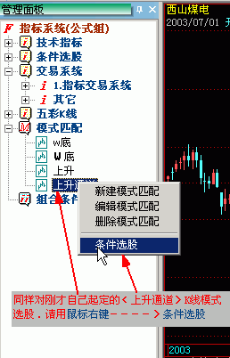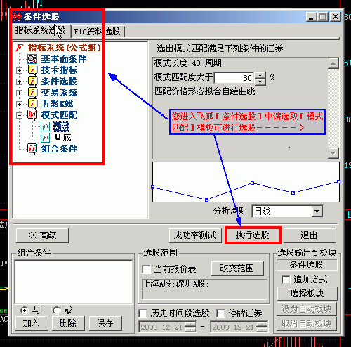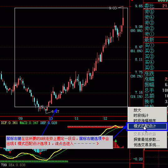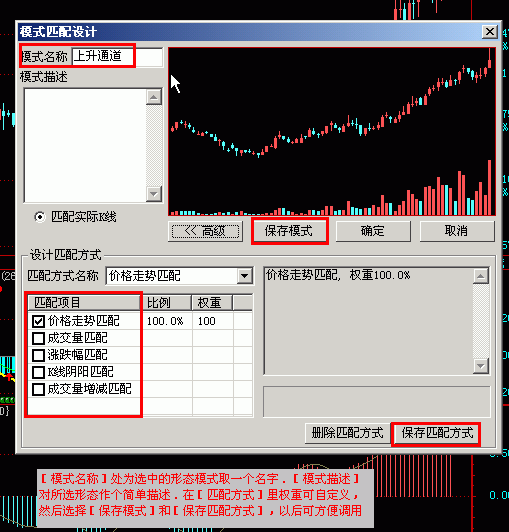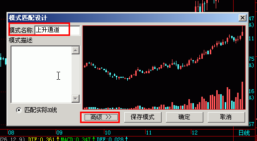 飞狐功能介绍:模式匹配设计(图解) 收集:中国股票市场经济分析网 通过模式匹配设计窗口,我们可以自己任意设计出某周期内的任何形态,通过系统选股平台进行形态选股。1.匹配自绘形态:点击“分析”---进入“模式匹配设计”。 由于实际k线中有时较难寻找到使用者心目中的理想形态,因此自绘形态就能较好的解决这问题,无论任何形态,都可以通过系统的模式匹配设计中的匹配自绘形态做到,并能将其保存为一个模板进行多次的调用。 图片: 图片: 2.匹配实际k线:由k线图中使用鼠标右键拖动一段区域中弹出菜单中进入 图片: 3.点击“高级”会弹出以下界面:模式名称:为选中或自绘的形态模式取一个名称。模式的描述:可以将选中或自绘的形态模式进行简单的描述,方便使用. 选择其中的匹配方式(权重可自定义)后,点击“保存匹配方式”,为该方式取名后保存,以后就可以方便调用。 图片: 图片: 模式的使用:在“条件选股”中,选取“模式匹配”模板即可进行选股。 图片: 图片: 模式的使用:在“条件选股”中,选取“模式匹配”模板即可进行选股。 【发表评论】【加入收藏】【告诉好友】【打印此文】【关闭窗口】 相关内容 上一篇教程: 如何在飞狐中添加自己的特色指标菜单 下一篇教程: [大智慧新一代] 益盟操盘线是很好的主图
