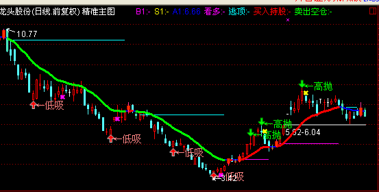 DRAWTEXT(CROSS(庄家,散户) AND 散户>70,H+0.05,'←高抛'),COLORGREEN;