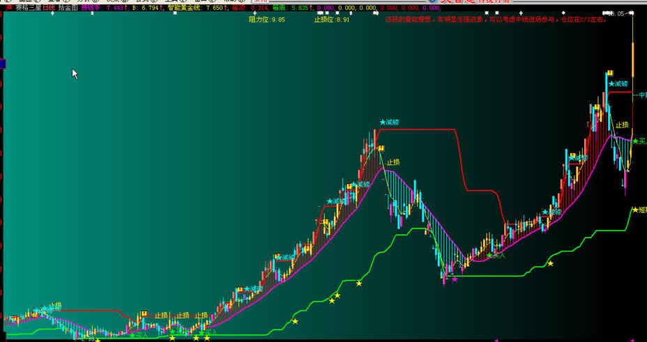 STICKLINE(VAR19 AND(趋势线>REF(趋势线,1)OR 智能黄金线>REF(智能黄金线,1)),CLOSE,OPEN,3,0),COLORFF00FF;
