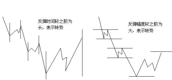 当市场在下跌的趋势中,若市场反弹的时间第一次超越前一次的反弹时间,表示市势已经逆转。同理,若市场反弹的价位幅度超越前一次反弹的价位幅度,亦表示价位或空间已经超越平衡,转势已经出现。