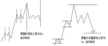 当市场在上升的趋势中,其调整的时间较之前的一次调整的时间为长,表示这次市场下跌乃是转势。此外,若价位下跌的幅度较之前一次价位高速的幅度为大的话,表示市场已经进入转势阶段。