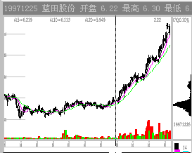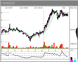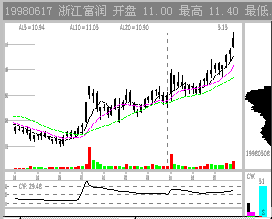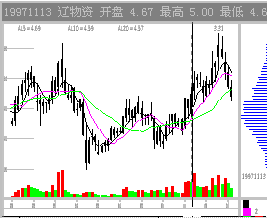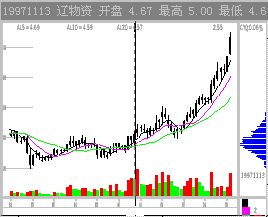 图2-1-7 深万山涨停出货 5. 逆市吸筹 逆市是看庄的最佳时机。逆市上扬的股必然有庄。高位逆市飘红是主力护盘,低位逆市飘红则为主力吸筹。而且,敢于逆市建庄的主力应该是实力庄家,毕竟,逆市要冒更大的风险。 五、主力震仓 股价突破后主力常常有震仓行为,因为主力不愿意那些短线的不坚定分子在未来的走势中搅局。股价涨到一定程度时会有获利回吐,庄家也会为减轻将来拉升中的抛压,顺势打压,这也是震仓。低位的震仓有时也叫洗盘。 震仓期CYF值不宜过高,20左右最好,(参看投资操作手册CYF一章,CYF刚刚进入活跃期)经验不丰富者最好在震仓结束后,升势确立进场。 1. 中线打压震仓 震仓能否顺利进行要看大盘当时的趋势,如果正值大盘回调期间,庄家可能会故意砸盘,做出图形破位放量下跌的样子,同时也对前一阶段技术指标进行修正。成功的庄家一次震仓可以使建仓成本比迎头拉升成本下降3~5%。 震仓基本上是股价下跌,如果大盘配合的话,庄家会把股价砸到普通投资人的止损位以下,也就是跌回盘整箱体7~10%,使买家觉得介入该股是个错误而在反弹时出局,而此位置正是前几天CYQ密集区的上沿。这种砸盘的成交量有很大部分庄家自己的对倒量,下方的坚定买盘才是真正的庄家关系户的抄底盘。如果大家发现股价向下跌而到了CYQ密集区止跌,就要密切注意了。 少数庄家会让股价先向上小幅度冲一下,然后朝下压,给人的感觉是弱势反弹结束,重新向下寻求支撑,图形上可能会构筑双底,也可能创出新低。如(图2-1-8)0511辽物资97.11.13日后的震仓行情最为典型。冲高后4连阴急跌18%,KDJ、RSI、MACD等常用指标全部走坏。到了CYQ密集区上沿该股止跌,而后展开疯狂拉升。