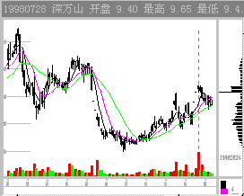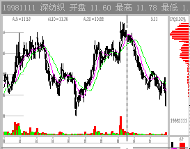 图2-1-16 丹东化纤98年初行情 图中,主力成本约8元,象这样的低位充分吸筹,主力至少要拉抬30%方能获利了结。但30%的位置是有一部分其上市首日的套牢盘,尽管很少,但它的出货会引发盘中获利散户的出货。12元又有一个天价位,又是散户的出货位置,想象什么位置可以激发多头想象?是13以上。一旦股价突破13,则上方一马平川,12元天价的阴影彻底消除。所以13元是主力至少到达的位置。实际上主力是拉高到16元后在16到13元之间完成出货。投资者在13到16之间出局都是对的。 行情的最终目标位决定于主力的状况和行情的性质。操作中不能拘泥于这个目标位,一旦行情出现异常,或者主力逃庄,该走还是要走的。 图2-1-17的深纺织也很说明问题。在股价暴跌前主力先突破天价,形成一个假突破,主力顺利出局。