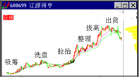 图2-1-1 主力的做庄过程 这是标准的主力做庄,但不是所有庄股都做的那么清晰,主力常常省略其中的某一些阶段,以使其行为变得更为隐蔽。比如他可以进货后直接拉抬,目标位一到就出货,就象上海九百(600838)98年10月的一段行情那样。但无论如何,进货和出货总应该是有的。 洗盘出现在主力入场之后,由于部分短线客跟庄买入,主力如果希望把他们甩掉,就可以洗盘。洗盘的位置在主力进货位上方不远,通常的形态是横盘震荡,但又跌不下去。我们常常利用主力的洗盘判断主力的仓位,市场满盘获利而不跌,是主力大量持仓的标志。 整理是另一类的横盘,这时股价已有一定的涨幅,主力在此位置上停一下,让获利者了结,换上另一批新多头,已有利于行情的继续上涨。 在主力做庄的过程中,大量的使用消息和题材。象上面那只股票,在主力出货过中,大量散布利好,结果主力把希望留给了散户,把财富留给了自己。 二、主力的做庄手段 这么高的股价,居然主力能全身而退,散户勇敢杀入,没点手段是不行的。 1. 发掘题材 “据市场传闻,该股有三大利好题材…….”,这是我们很熟悉的早期股评。 主力做庄,第一步是挖掘题材。而后吸筹,再有计划的将题材公布于众。 当少数圈内人获知这些题材时,还真是灵验的。于是形成挣钱示范效应,这条消息通道也随之被认为是黄金隧道。最后大量的消息从这条隧道中涌出,主力也就有了出货条件。 听到消息时,一定要看看图,想想这条消息为什么跑到我的耳朵里。 2. 制造概念 形成概念是人脑的机能,不幸的是,股市中的人们常常被一个概念套牢。 96的绩优概念,97的回归概念,98的重组概念以及99的网络概念,哪一次没套过人?股市的概念是一种广告效应,当一个概念被市场炒热的时候,您说这时庄家该做什么? 3、激发想象 中国人崇尚眼见为实,如果您说服一个企业家投资一个项目,他常常要您拿出一篇长长的可行性报告,必要时您还要使用点公关手段。但股市中不用,我们常听股评家说,该股想象空间巨大。就是说,股市凭想象就有人投资。 如果街上一个卖豆腐脑的,忽然某天改卖电脑了,您能想象他能赢吗。但如果这个卖豆腐脑的是个上市公司,问题就不同了,它就就有了巨大的想象空间! 想象空间对于主力来说是必不可少的。没想象空间,他的货谁卖呢? 4. 形成规律 股市的规律有时候是人造的。 比如主力吸筹,他可以让一只股形成有规律的上下震荡,每一次冲高都是卖出机会。而当人们真的逢高卖出时,主力则通而吃之。 单边上扬也是一种规律,什么时候卖都是错的。本人的一个朋友曾亲口对我说:历史证明,(这只股)什么时候卖都是错的。结果他被高位套牢。 有时股价忽然回调,当大家正在担心时,股价又创新高。过几天又回调,结果没跌多少又涨了。看来每一次回调都是进货机会。真的是吗?如果您试试在下一次回调进货,那么您就知道厉害了。 还记得《狼来了》这个童话吗?有个小孩不懂事,乱喊狼来了,结果骗了两次全村的人,孩子以此为乐。有一天狼真的来了,孩子怎么喊,大人也没去救。 这就叫市场心理训练。反复形成同一个规律,当市场形成共振时,有人就要倒霉了。 三、主力的做庄风格 人跟人不一样,庄跟庄也不一样。 按照吸筹、洗盘、拉抬、整理、拔高、出货的程式的做庄风格叫标准庄。很有些学院派风格。 但有人不这么干,高位吸筹,迅速拉抬,坚决出货。行情来得快,来得猛,去得也急。主力一进一出,用了大量的价格空间,自己只能挣其中一部分。这种庄叫海盗庄。 也有些股长期做慢牛行情,常出现在一些绩优股上,这些主力认为自己在做投资,完成个股的价值发现。他们很象牧场主,养了一群牛,我们可以叫他们牧牛庄,不过要注意,牧牛人养牛不是为了好玩,牛总要养大,养大了就… ...。 也有养鸡的,隔一段时间给主人下个蛋。这类股的走势是大幅度震荡,主力做高抛低吸。同样,鸡不是总有那么高的产蛋率,如果这只鸡下蛋困难了,要么养肥点卖了,要么直接杀了吃肉。 准确判断庄家性质,不要用买一只牛的价钱买了只鸡。 四、主力吸筹 我们中小投资者与机构投资者在资金消息上无法可比,但先知道消息的人会采取行动,所以我们通过技术分析捕捉先知先觉的人的行动,等于你知道了消息。大资金入场必将对股价构成影响,主力又想吸筹,有不想被发现是困难的。 1. 低位温和吸筹 此种吸筹方式为被动性吸货形态,多出现在年底和年初,此时市场沉寂,而庄家悄然进场。 特点:震荡逐步缩小,底部逐步抬高,筹码向低位转移。说明庄家悄然进场,只在自己计划区域横盘吸货,但大资金进场,必然构成底部抬高,筹码密集。如(图2-1-2)山西焦化97.9--98.2月的吸货过程,最后拉升到6月初股价上涨40%-50%。