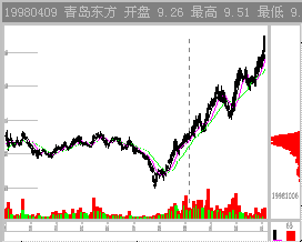 3.通吃套牢盘吸货 此种吸货为进取式的吸货形态,庄家实力强,资金集中,作高的愿望强烈,往往出现在逆势中。 特点:带量穿越并突破前期套牢密集区。 说明:庄家在大盘消极无热点时资金比较集中,在套牢区下沿吸货,甚至在套牢区内吸货,建仓时间短,成本高,采用逆势拉升手法,速度快拉升高,当大盘转暖时顺势出货。如(图2-1-5)青岛东方98年底的行情,以及同期的600651飞乐音响等。