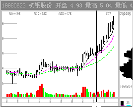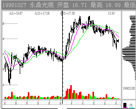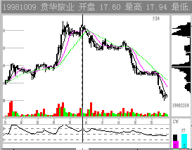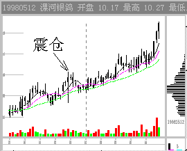 图2-1-12 吸筹震仓 这种震仓方式在其打压时是不容易识别的。但随后出现的主力通吃套牢密集区暴露了目标。 如果能正确判断主力震仓,在操作上就占据了主动权。震仓是一种骗线,一旦被识破,主力则一定程度被动。当然,主力一般可以完成震仓计划,因为识别主力震仓是非常复杂的技术。 六、主力拉升 在准确判断主力吸筹,又在主力洗盘时保住了仓位,一旦主力终于开始拉升,大家多少可以松半口气了。 常常出现的错误操作是刚刚获利就轻易抛出了。这种以自己是否赢利来决定买卖是错误的,因此要理解主力的拉抬过程。 1. 判断主力的持仓量 做一个庄到底需要垄断多少筹码?做过操盘手的朋友告诉我们,一个短线炒做需要控制20%以上的流通盘,中级波段式炒做需吃下50%左右的筹码。从技术分析上虽不能估计主力的精确仓位,但至少可以定性的知道主力是巨量持仓还是少量持仓。 主力控盘的标志是市场满盘获利而股价不跌。我们以佛山兴华(0685)97年10月17日的状态为例: