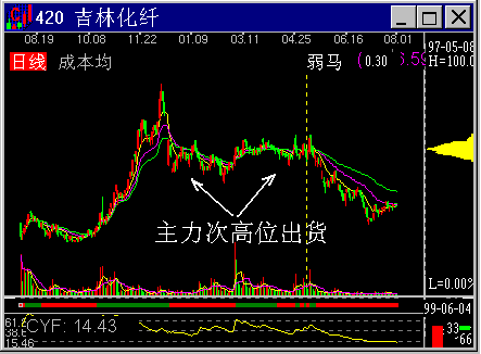 图2-1-17 主力突破天价后派发 看来主力的行为有其必然的逻辑。这是因为主力的最终目的是获利。这就是我们说的市场约束。主力至少不愿意做使其亏损的事,于是也就使我们有了估计其下一步动作的可能。 七、主力出货 主力进货不容易,出货更难。主力出货一般都要大盘或消息面的配合。但简单的认为消息出台股价一定就跌也不对,因为这个规律一旦形成也会作废,因为它是个简单规律。所以,在技术上研究主力的出货是必要的。 1. 主力出货的常见K线形态 在K线上,主力出货会在出货时留下一些痕迹。常见的是熊长牛短和绿肥红瘦。牛长熊短是主力缓缓派发,股价慢慢下跌,但跌至某个支撑位又被主力快速拉起,随后再走慢熊的N形走势。绿肥红瘦某段时间K线上大量的是阴线,只有少量阳线的K线组合形态。 K线组合形态对识别主力出货有一定的帮助。但仅靠K线是不够的。 2. 主力的高位出货 这是主力最理想的出货。CYQ的高位密集是主力高位出货的标志。当然,CYQ的高位密集有时是换庄,这要从高位密集后的股价突破方向来识别。 3. 主力的次高位出货 但如果主力做不到高位出货,它会寻求在一个比最高位低一些的位置上完成彻底离场。往往次高位出货比高位出货要容易的多。高位出货套的是追涨盘,次高位出货则把逢低买入的人套住。 图2-1-19中的吉林化纤在96年末实现拔高出货,于是在97年初在相对低一些的地方完成了筹码的转移。