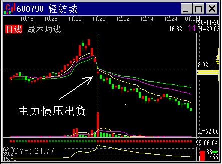 图2-1-18 主力的次高位出货 4. 主力的惯压出货 也许是市场出了问题,也许是主力出了问题,有时主力会连续向下惯压。抄底抢反弹者尽数被套。主力惯压出货的标志是在技术上的支撑位上放巨量,以及连续的股价下跌,CYF反而拉升。如轻纺城600790的主力恶劣出逃。