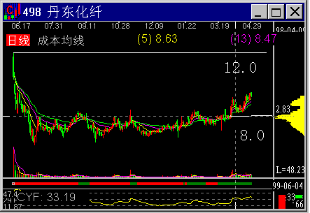 3.庄家的目标位 判断庄家的目标位是困难的。盘子在人家手中,操盘手随时又可以改变计划。但在某些情况下,我们可以知道在某些位置上是主力最佳的出货点,这个位置可以大致确定为主力的目标位。 首先说一个定理:主力不可能在散户的出货位置上出货(指南针第四定律)。什么是散户的出货位,就是那些明显的利空价位。如天价位,明显的压力线的位置,前期套牢阻力位。主力出货最怕惊扰了散户,如果这个地方天生就要散户准备出逃,主力一般要回避这些位置。 超跌反弹的股,其上升到前期密集区一般会受阻。但也可以有转化为通吃套牢密集区吸筹,这要看在这个套牢区主力是如何运做了。 反弹行情不同于超跌反弹。超跌反弹一般没庄,反弹行情则是主力前期部分出货,但没有出光,随后主力做的自救行情。如果在反弹前股价已经向下拓展了足够的空间,那么反弹行情常常在股价接近前期套牢盘的被套位置就结束了。 常规的判断主力目标位,可以首先看主力成本上方的30%,看看那里主力是否可以出货,如果不能,主力则必须进一步拉高,直到某个没有散户的集中抛盘,甚至是某个可以激发散户无穷的想象的位置。如丹东化纤(0498)98年初的行情(图2-1-16):