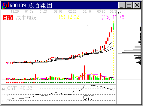 图2-1-14 成百集团主力巨量持仓 其中的原理是这样的,成本均线发散上升,说明不同时期进货的投资者获利差距在迅速拉开,早期进货的投资者获利巨大,如果不是低位的货大多数是主力所有,那么就成了主力给别人打工了。至于CYQ低位锁定,也说明被锁定的筹码几乎都是庄的,因为散户在股价上升中拿不住货。那么CYF在股价上升中反而下降,则说明股价的上升已经不需要公众人气的抬轿,因而也成了主力巨量持仓的特征。 上述三个主力巨量持仓的判断依据只要出现一个就可以说明主力巨量持仓,上图中的三个条件同时出现则为极特殊的情况。 2. 主力的拉抬方式 在不同的仓位状况下,主力做一次中级幅度的拉升,可采用两种拉抬方式:锁仓拉抬及对倒拉抬。 锁仓拉抬就是主力先吃下大量筹码,把盘子搞轻,随后只用不多的成交量就可以把股价拉抬上去。图2-1-14的成百集团就是一例。锁仓拉抬方式对于主力来说是出货困难,因为他的货太多。但对于跟庄操作来说反到是件好事,您不急于获利就走,反正主力走不了。 图2-1-15是一个对倒拉抬,CYQ发散、成本均线密集,股价同CYF同步上升。主力之所以对倒,主要是因为他持仓量不足。主力对倒拉抬的股,其行情所持续的时间不长,但上升猛烈。一旦趋势线被破坏,或者CYQ高位密集,就可以出货了。