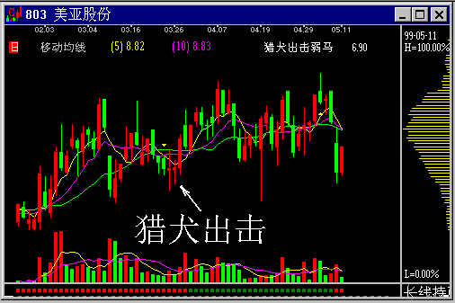 图2-2-4 猎犬出击 每一类的获利机会,就有相对应的买入办法。研究在继续,操作点在增加, 对于高手,指南针10大戒条将不再成为限制。 |