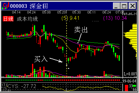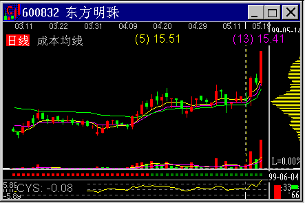 图2-2-1 猎鹰出击 图2-2-1是猎鹰的一次漂亮的出击,图中的CYQ是97年5月23日猎鹰买入的CYQ状态。这个买入卖出操作是电脑自动做的,其买入点的CYS是-27.72,无论如何也是严重超跌。 三、主力通吃套牢密集区吸筹的买入 发现主力通吃套牢盘吸筹,可以在第一时间买入。主力通吃套牢密集区是一种高位吸筹,对主力来说,最佳的操作路线是迅速拉离成本区,形成扎空行情。 图2-2-2是东方明珠99年5月14日的筹码分布,以后的三天内股价放量穿越了套牢密集区,这是个绝佳的入场机会,随后的行情大家是很熟悉的,它涨了一倍。
