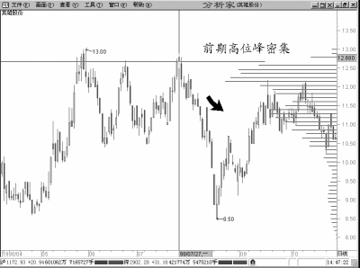 股票跌穿单密集峰,如果股价超跌而原单密集峰并没有被消耗,行情将发生V形反转,反转第一目标位在原密集峰处。本技法实战要点:股价跌穿原单峰密集;股价下跌的速度较快;下跌至超跌区原单峰密集仍完好存在;超跌V形反转确认后即时跟进;股价反弹至原单峰密集区域出场观望。600844 英雄股份经一轮上涨行情于98年7月24日形成单峰密集。随后该股由13元一路暴跌至8元。在其超跌的底部区域,以8月18日为基准点,成本分布表明其原密集峰并没有减小。于是该股超跌V形反转上行,涨至12元在原密集峰附近回落下行,一轮反弹行情就此结束。