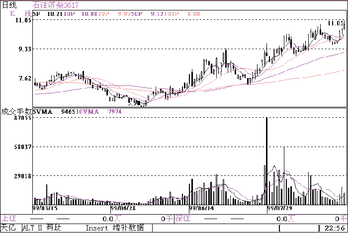 由上述可看出:在散兵坑形成的初期,通常股价亦同时调整,短期并无止跌迹象,此时暂不宜参与。随着成交温和放大,股价缓慢走出谷底, 5 日均量线上穿 10 日均量线时往往是介入的好时机。量比价先行,随着量的增大股价迟早会跟着上涨。成交量爬出散兵坑之际往往是多头出击之时。石油济柴( 0617 ) 99 年以来形成两个散兵坑,一个是 3 月 30 日至 5 月 14 日,同期股价由 7.88 元跌至 6 元,另一次是 7 月 7 日至 7 月 22 日,同期是该股短线调整的阶段,多头主力伏在散兵坑里休养生息,随着量能的增大,成交量爬出散兵坑后相应地出现了两波行情。了解散兵坑的意义在于:散兵坑成交极度萎缩,说明市场惜售,庄家无意发动行情。待成交温和放大,缓慢走出散兵坑之际应重点关注。庄家在散兵坑内休息,投资者亦不妨暂时休整。投资者常发现有偶然一两天成交量破坑而出的情况,短期成交忽然增大,此时需关注均量线的排列状况,若均量线仍呈空头排列,说明短期整理尚未结束,此时仍未到介入时机。