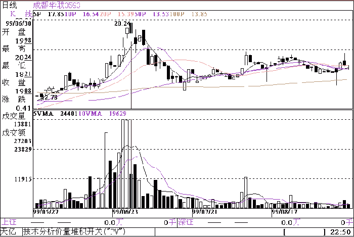 - 散兵坑 - 的技术形态有如下特征:股价处于调整阶段或是横盘阶段,短期内无上攻迹象;成交量持续萎缩, 5 日均量线下穿 10 均量线形成死叉,并且成交量一般低于中短期均量线;整理未期,成交量温和放大, 5 日均量线逐渐上穿 10 日均量线。整体上看,成交量呈两边高、中间低,柱状图上面横亘着均量线,这些即为标准的散兵坑。如成都华联( 0593 ) 5-6 月份随大盘快速上攻, 6 月 30 日短线见顶后回调,相应地成交量亦快速萎缩, 7 月 5 日 5 日均量线跌破 10 日均量线,散兵坑的左边已形成,其后成交一直萎缩,有时甚至一天仅成交 1 千多手,柱状图基本低于中短期均量线, 8 月 3 日起成交量温和放大,柱状图已触及 5 日均量线, 8 月 5 日起 5 日均量线上穿 10 日均量线,第二天更是放量突破整理区,显示新升浪正式展开。