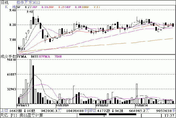 投资者对带长上影的 K 线宜保持高度警觉,特别是大批股票同时出现该形态时,大盘见顶的可能性极大,如 6 月 25 日有焦作万方、江苏工艺、隧道股份、道博股份、银基发展、桂林集琦、大冷股份等等大批个股同时出现带长上影 K 线,大盘走势已呈强弩之末; 6 月 30 日又有新农开发、中福实业、万家乐、四川锦华、甘长风等大批个股出现带长上影 K 线,大盘和这些个股同时见顶;出现带长上影 K 线的同时一般伴随较大的成交量,此为庄家出逃的 - 铁证 - ,宜及时出局,如 ST 网点 98 年以来的几个顶点, 98 年 7 月 3 日、 98 年 11 月 9 日、 99 年 4 月 12 日,都为放量的带上影 K 线,每出现此形态都引发一轮急挫,见顶信号极为明确。
