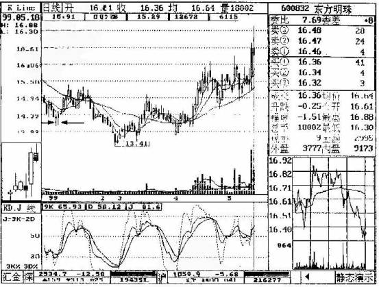 2、庄家为了了解市场对该股筹码的买进兴趣,在有准备的情况下将用手中的少量筹码出其不意地将该股的股价突然大幅打低,以便观察有多少恐慌抛盘吐出或有多少场外买盘对它的低价位感兴趣而去展开买进动作,以此了解打压该股的下档支撑极限。如果打压超过该极限打压出去的筹码就可能无法再次买回。其具体表现在图表上就是在风平浪静中突然出现一根长长的下影线,这叫向下试盘,目的是测试场外买盘力度,界定打压极限。见图二东方明珠。附图说明。