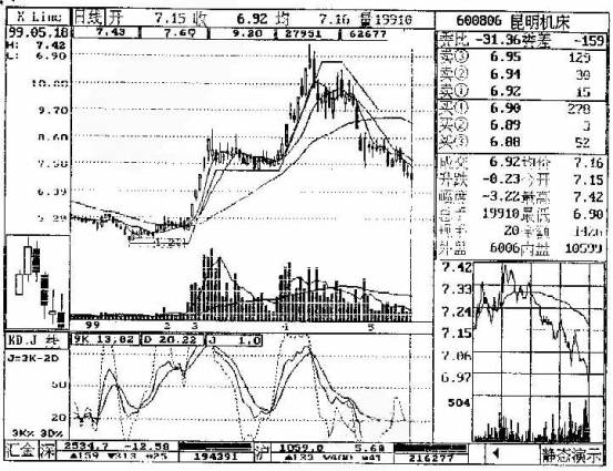 (二)实战出货操作难度:庄家坐庄一只股票从试盘、拉高、洗盘都可以从理论上达到必然的成功,也就是说都可以完全为庄家自己所控制。这些事情庄家通过自己不懈的努力等可以做到。只有出货无法自己控制,因为跟风盘买不买进是他们的权利,跟风盘不买进庄家就无法卖出。庄家唯一能做的事情就是欺骗跟风盘,而人家上不上当是另一回事,庄家无法强迫人家。所以出货是庄家坐庄行为中最为困难的环节,中国股市中大概有60%的庄家都在出货的环节上招致惨重的失败,因不能兑现而痛苦万分。庄家炒技高绝对不是本事,有许多庄家是蠢笨而痛苦万分的,如:阿城钢铁、康达尔等。