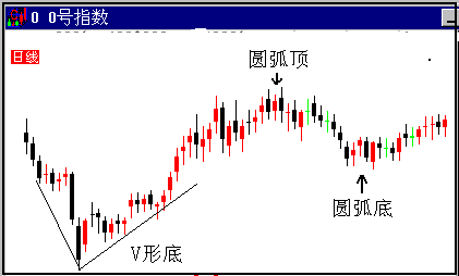 图1.1.5 疯熊特征 当0号指数出现疯熊特征后,市场的熊市也就走到头了。一旦止跌,随后应该发生的就是强劲反弹。 至此,对0号指数的通道走势的操作已经清晰了,上升通道持股,如上升通道转化为疯牛市,则一旦停止上涨必须全线出货。如上升通道支撑失守,则离场。对于下降通道,全程持币,如指数向上突破压力线,则逐步建仓,如形成疯熊市,择机抢反弹。 四、 圆弧顶和圆弧底 0号指数的圆弧顶和圆弧底是非常可靠的短线转势信号。 0号指数的圆弧顶表示短线资金入场受阻。圆弧底是短线资金停止离场。如图1.1.6。 圆弧形态可以反转一个趋势,但不是所有的行情反转都是采用圆弧方式,不是圆弧状态的顶和底叫尖顶和V形底。如图1.1.6左边的V形底。
