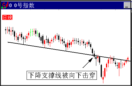 图1.1.4 0号指数的上升压力线被向上突破 这就是说,一个原本已经是不错的牛市行情,出现更牛的上升速率,这种行市当然就是疯牛市。出现疯牛特征意味着上升行情已经到了最后阶段。由物极必反的原理,疯牛市的结果是行情转入暴跌。 与疯牛特征相反的是疯熊特征,当股价向下击穿一个下降的支撑线,市场就成为疯熊市了。就如图1.1.5。