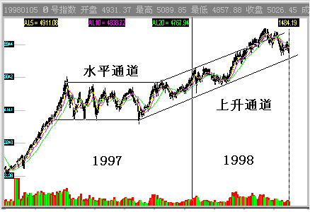 图1-1-1: 0号指数的震荡通道 图1-1-1中含有两个中期震荡通道,一个是97年到98年上半年的水平通道,自97年5月12日之后,0号指数进入了一个7个月的横盘。 这个横盘走势意味着整整7个月的时间沪深A股的二级市场的资金维持一个恒定的资金存量。这个横盘走势同上证指数及深证指数明显不同,尤其是深证成指在走逐级下跌的熊市,但0号指数的横盘却揭示了长期被隐藏的市场事实,就是在偏弱的97年后半年,市场资金并未减少。如果以资金流入或流出股市来判断牛熊的话,这期间既不是牛市,也不是熊市,只能称之为弱平衡市。 考虑到在图1-1-1中0号指数运行在水平通道之中时,新股正在大量发行。这意味着此期间流入股市的增量资金全部被用来购买新股。这几乎是新股发行速度的极限! 由此我们判断出政策面上此间的股市政策,就是以市场承受力为依据最大限度的发行新股。97年9月23日,0号指数瞬间击穿水平通道下轨,这是一个危险信号,说明市场可能就此崩溃。但随后的走势表明管理部门及时调整了市场政策,尤其是98年元旦前后0号指数创出了新高,说明市场已有增量资金进入二级市场。98年上半年,0号指数呈现出一个上行震荡通道。事实上,自98伊始,市场进入了新的一轮牛市。那么98年3月就成了该年度最佳的买入时机!