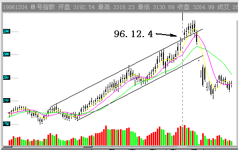 三、 疯牛特征和疯熊特征 一般情况下,上升通道的支撑线被向下破位,这个上升趋势就结束了,同样,下降通道的压力线被向上突破,这个下降趋势也就结束了。但股市的趋势常常在转变前走向极端,这就是疯牛市和疯熊市。 当一个上升的压力线被向上突破,这种技术形态就是疯牛特征。就如图1.1.4中所显示的96年12月4日的0号指数。