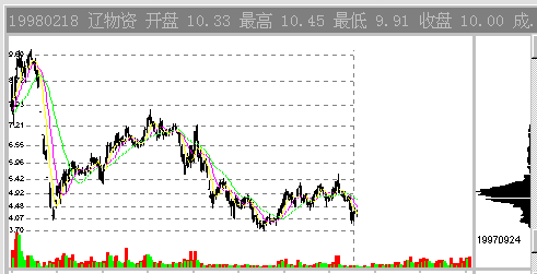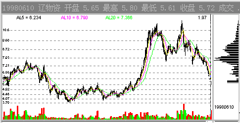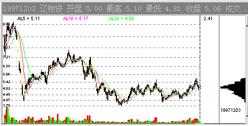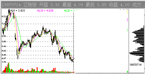 图1-2-2: 下跌之后的CYQ发散状态 97年7月14日的辽物资(0511),此时,股票当前价位上方是一层一层的套牢盘。从中线的角度看,是没有多大的上涨空间的。因为一旦股价大幅上涨,这些套牢盘的的解套出逃行为会耗尽多头的能量。此时假若股价上涨的话,4.7元附近的CYQ套牢峰会对股价构成巨大的压力。图1-2-3中显示了该股其后的走势,充分证明了这个压力的作用。
