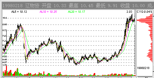 其实股票的高位密集有两种市场含义,一是主力出货,二是换庄。它们对后市的影响是截然不同的。判断是哪一种情况比较复杂,一般的方法是先看大势,在一个弱势行情中,别的主力是不敢高位接别人的盘子的,这种弱市牛股一旦CYQ高位密集几乎肯定是主力出货。但在大势强劲时情况就会复杂些,为了规避风险,遇到CYQ高位密集先出局观望总是明智的。其次可以看位置,如果股票涨幅不高,CYQ的高位相对密集可能仅仅是由于主力的震仓换手所致,后市还可能上涨。但若已有可观的涨幅,则要警惕主力出局了。最后看结果,若主力出货,则股价一定不可能保持在高位,若是换庄,则要创新高。因此,在出现CYQ高位密集时先离场,等方向明了后再做决定是个安全的做法。因为一旦主力完全出货,后市的下跌一定是相当惨烈的,正如辽物资在图1-2-8的表现: