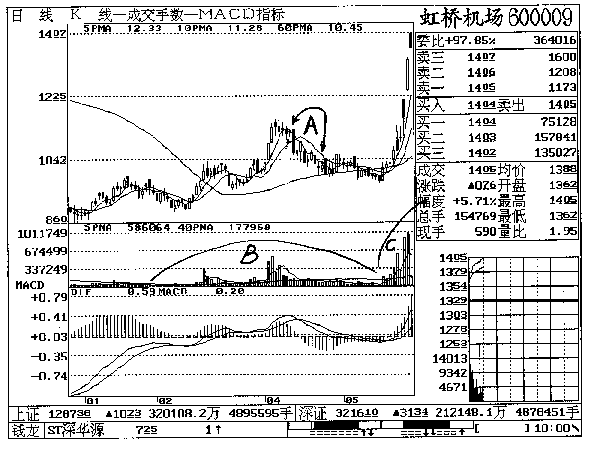 | 蒋:现在我们来看图纸,其中A箭头指的是4月12日到4月22日主力震仓的8天,正好被你的【5分钟OBV能量潮】侦察到有主力在建仓。以后该股在60日均线处开始启稳,5日、10日金叉稍跌破60日均线,在成交量图上留下一个水坑,这是变形的【青龙取水】,只是青龙 下到河里取水罢了。既然已经涨起来了,你就要相信我们的理论:【青龙取水】之前的B区 间为【潜收集】;之后的C区间为【强收集】;现在刚刚进入【拉高】阶段,此时要坚决持 股,直到出现【三死叉见顶】为止。 张(99年7月某日):记得我是在6月29日股价跌破14.25元时出货的(见图中A箭头), 因为5日、10日均线在那里形成死亡交叉,MACD也有死亡交叉,成交量柱体图上连续出现黑 色阴量。现在回过头来看,当时出货是对的。杭州不少大户希望能到上海跟你们操盘,不知可以吗?(图600009-3) 蒋:可以的。上海至杭州的高速公路只需两小时,有时我们也在杭州操盘,到时候请这些杭州大户一起聚聚。 |