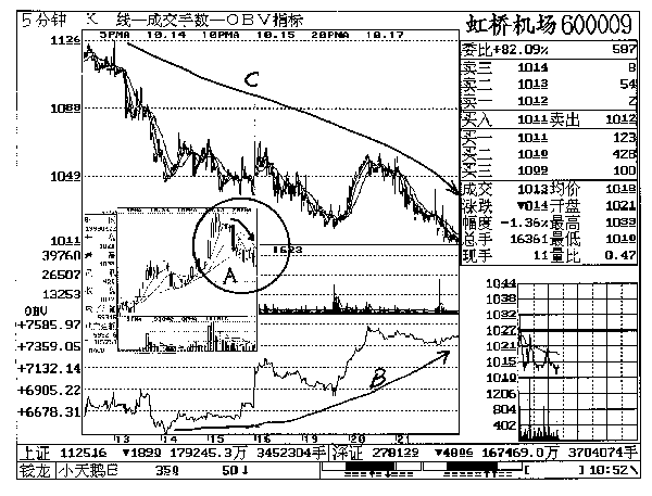 | 杭州 张树榕 张树榕(99/04/22 10:52分):杭州股民把你们传得很神,朋友介绍我上www.gwgz.com主页,没想到以后一发不可收拾,每天不看《雷大户日记》就睡不着觉,特别是上海的短线培训班更是我神往的地方。我冒昧地给上海6201邮政信箱(200062)写信报名,没想到很快就收到回信。几个月来通过传真我学了不少短线技巧,不过有一点我不太理解,就是如何用【5分钟OBV能量潮】寻找黑马,您能帮我详细讲解吗?比如说,今天虹桥机场是跌的, 现在已跌去1.36%,从12日的11元跌到今天的10.10元,为什么李老师却说它的能量潮在上升?还说有机构在收集筹码?我可以买进吗?(图600009-1) 蒋十九:要知道机构在建仓初期的买入量一定大于卖出量;机构在出货的时候,卖出量一定大于买入量。既然如此,我们只要观察【5分钟OBV能量潮】就可以了。从图上看4月12日到今天股价跌去1元,日k线图上是连续下跌的K线(见A圆圈内的箭头)。【5分钟OBV 能量潮】从12日以来却在缓慢增长(见图中B箭头),这与不断下跌的股价(见图中C箭头) 正好形成相反的走势。现在很容易解释这种表面上股价下跌,实际上OBV能量潮上升的现象: 主力用较少的筹码打压股价,然后买回较多的筹码。这是李老师判断有机构在虹桥机场中收集筹码的理由。如果你有半年不用的空闲资金,建议你全部买入虹桥机场,用不了半年必然会有收获。 张(99/05/31 10:00分):我非常敬佩您和李老师和的短线技术。今天虹桥机场只用了半小时就涨了5.71%,这已是连续第三根长阳线了,现在该怎么办?(图600009-2) ![]() |