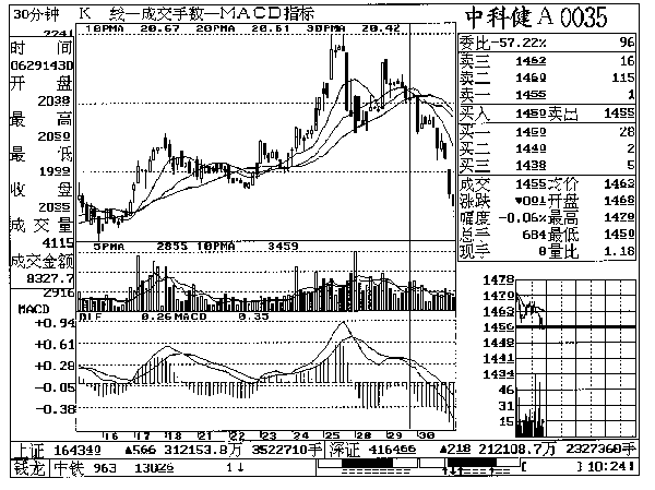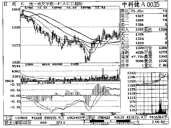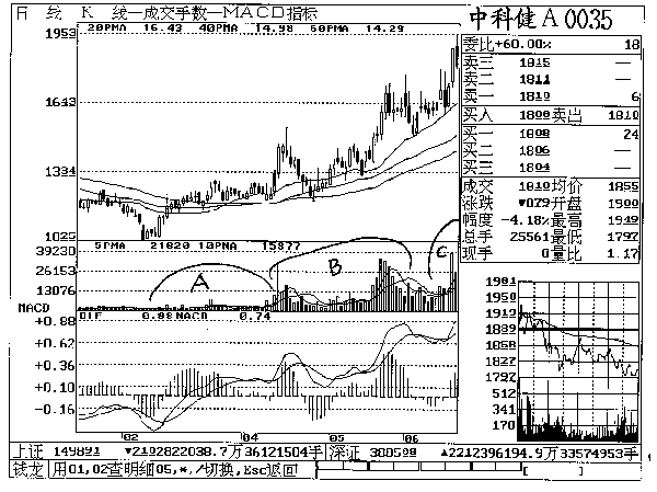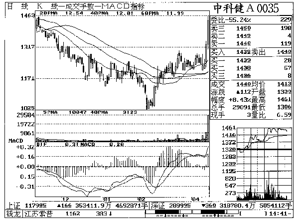 | 李:我也在注意这个股票,今天的成交量可谓【量顶天立地】,钱龙图上显示从去年 11月份到现在一个多季度,今天的量大的惊人,已达到290万股,而该股的流通盘只有 2134.76万股,现在买入正是时候!另外还有一个秘密:去年9月份的头部量最大的一天为 206万股,现在的底部量大大地超过这个数字,这叫做【底量超顶量】,这可是难得的机会。不过,深成指这几天的走势并不好,昨天跌破20日均线2908点,形成【断头铡刀】。因此, 这一次深成指的下跌已是在劫难逃啊!由此可见中科健的走势和深成指的走势正好相反,一个由底部向上涨,一个由顶部向下跌。 史:根据老师的经验,我觉得可以把深成指的指数图制成透明胶片,反过来看正好等于中科健的上升走势。因此,每当指数筑头的时候我们只要准备好透明胶片就行了。用这种胶片反过来看,然后对照个股找黑马,这中科健肯定是符合标准的。 李:我的学生真聪明,以后你就多准备一些透明胶片,整天给我找黑马吧!但指数还有一波强劲的下跌,因此中科健还可能有一个回档。我劝你们用分批分量建仓的方法多选几个点买入,尽量降低成本。 史:我学过老师的【破季托后买入】,其中讲到用5日、10日均线的第一个黄金交叉点买入,以及用60分钟K线图买入。据我观察用30分钟k线图,在量竭尽的时候,一遇到30分钟K线托时就买入,这样股价是很低的,买入的时间也比较集中。不知道对不对? 李:对呀,对呀,我就是用这个办法。你怎么知道的?你以后到我身边来,我再教你用【15分钟K线抄底法】,那才是最低买入区间。 史:(99/06/18 16:38分)今天的中科健创新高后跌了下来,成交量比较大,收盘在18.10元。我们从12.40元买入,至今已有5.70元的增值,有些人已经沉不住气了,怕在这里筑头,想问一下您老,是否应该卖出了?(图0035-3) ![]() |