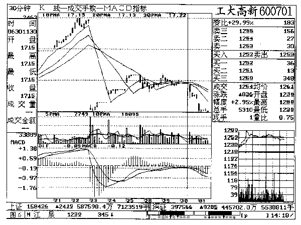 | 李振权:在李老师的指导下,我耐心的等待5日均线向下拐头。然而,到4月13日并没有见到5日均线向下拐头的迹象。4月12日工大高新成交量420万股,高开低走收阴线。是不是主力在出货呢?第二天上午9:48分我打电话给65010007李玉河。 李玉河:你看现在股价正在上升,已经涨了2.08%,量比达到1.80,走势很好。让我担心的是上证指数已经跌破5日均线1196点,10日均线1188点。看来,指数的反弹浪已经 接近尾声。前天的最高点1210.10点可能成为近期的高点。我们正在减仓,是为了跌停后 能介入强势股。不过,600701工大高新将保持一定的仓位,你的货不多,就没必要出货了。 图(600701-2) ![]() |