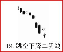 在下降的行情中又出现跳空下降的连续二条阴线,这是暴跌的前兆。通常在两条阴线出现之前,会有一小段反弹行情,但若反弹物力,连续出现阴线时,表示买盘大崩盘,行情将继续往下探底。
