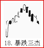当行情大涨出现三条连续阴线,即为卖出信号,这是暴跌的前兆,行情将呈一个月以上的回档整理局面。