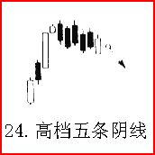 价格涨幅已高,线路图出现五条连续阴线,显示行情进入盘局,此时若成交量畏缩,更可确信行情不妙。