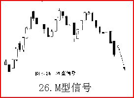 所谓M字型(或称倒W型)系指行情出现第一次天价后,开始回跌,当第二次向天价挑战时,却因大量卖盘涌现,无法突破第一次天价价位,在第一次天价价位附近形成第二次天价,然后下跌。这种形态类似英文字母“M”,故称“M字型”。这是明显的卖出信号。