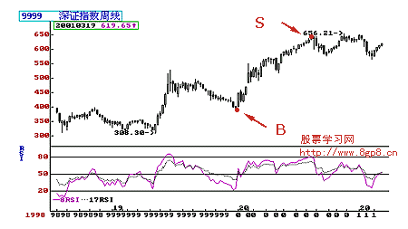 1999年12月24日,深圳指数8周RSI跌至22,可视为买入信号,其时指数值为399点;到同年8月11日,8周RSI见81,视为卖出信号,其时指数值为634点。理论上这次可获利58.9%,扣除税费为57.4%(图5)。