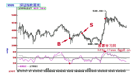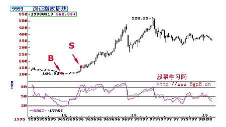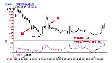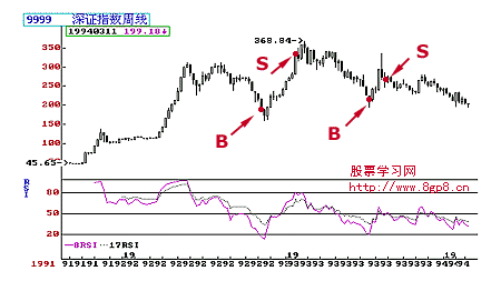 1993年7月23日,深圳指数8周RSI又跌至21,应视为买入信号,其值为214点;但8月份RSI却未能上冲80,反而于8月27日跌破50,视为卖出信号,其值为265点。理论上可获利23.8%,扣除税费后为22.3%。