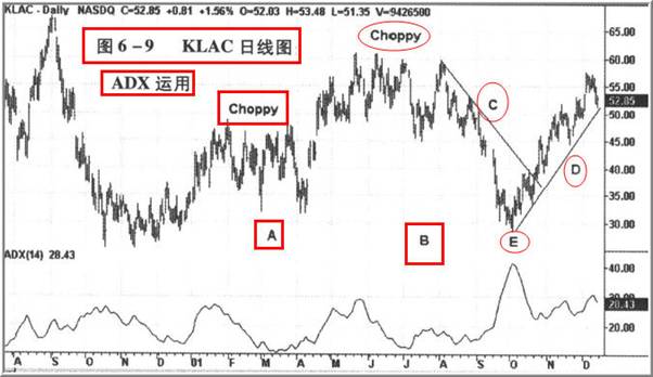 ADX 读数低于 20 ,就可以把当时的市况视为横向盘整,任何趋势跟踪系统都不适用,因为信号会经常反复。请参考 KLAC 的日线图(图 6-9 ) ,在 A 、 B 期间之内,市况属于横向整理的震荡盘, ADX 读数低于 20 ,有助于你判断当时缺乏明确的趋势。在这类市况下,如果你决定进场交易,最好采用摆荡指标(参考第 7 章)。在 C 期的下降趋势与 D 期的上升趋势期间内, ADX 读数都超过 30 ,显示当时的趋势很明确。至于 E 点, ADX 读数虽然很大,但已经由上升转回下降,这意味着当时的下降趋势已经逐渐丧失功能。 ADX 曲线下滑,代表既有趋势强度转弱,能够保持耐心的交易者,通常会得到应有的报酬。这个时候,或是等待情况更明朗一点才进场,或是等待趋势发生反转。如果 ADX 在 30 以上出现峰位,代表价格很可能会折返整理。