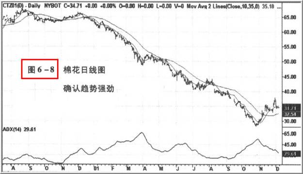 哪些市场或市况特别容易交易,这需要一些经验才能判断。 震荡剧烈的横向走势,很难进行交易 ,而且交易系统发出信号的频率会偏高。反之, 趋势明确的市场,比较容易交易。如果市场具备明确的趋势,就没有必要经常进出。 如果愿意,可以继续持有部位到趋势结束,如此不但会有不错的获利,还可以节省佣金费用。趋势发展明确的话,止损点也比较容易设定,而且不容易被一些假走势引发。只要趋势够明确,即使你错失进场机会,也不需追价,可以等待行情折返到趋势线附近再进场。 适当运用 ADX 指标,就可以找到趋势明确的市场。 由于趋势明确的市场比较容易赚钱,只要你能够找到这类市场,胜算就能大幅提高。请参考图 6-8 ,这是棉花的日线图,显示长达一年的下降趋势。即使你没有多少交易经验,应该也很容易看出图 6-8 的下降趋势,但经由 ADX 的确认,应该还是有帮助的。在 12 月到翌年的 4 月之间,当下降趋势刚开始时, ADX 曲线稳定上升,而且读数都高于 30 ,意味着下降趋势非常强劲。由 7 月到 9 月,下降趋势开始放缓,甚至出现横向走势, ADx 读数跌到 20 之下,但 9 月之后又开始回升,显示下降趋势又转向强劲。一旦 ADX 攀升到 30 以上,就适合寻找放空机会。