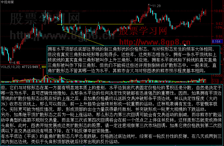 1、下降三角形一般多见于整理形态,其走势的最终方向也很易判别--下降三角形预示着股价下降。根据资料统计,与此相反的例外现象不到15%。