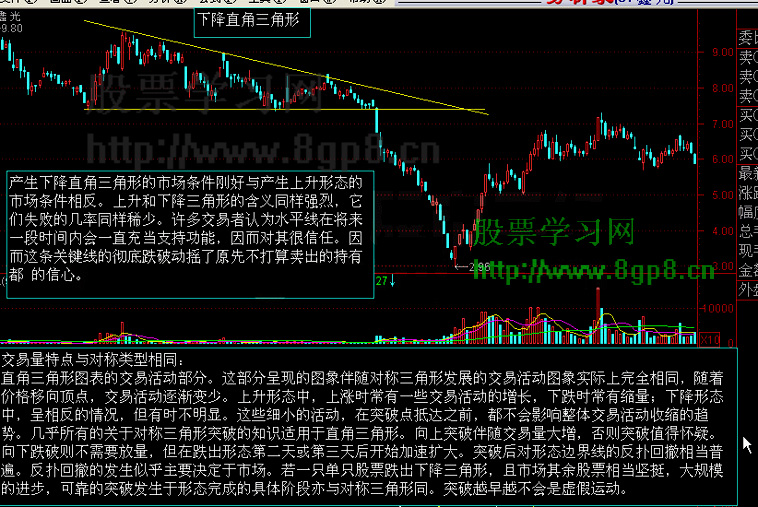 3、下降三角形若相反向上突破,则必须以大成交量来来验证:而向下突破后,股价应有一回升,若回升受阻于底线之下则形态意义成立,否则图形失败