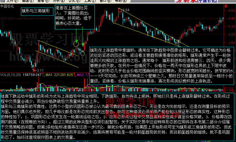 上升旗形。经过一段陡峭的上升行情后,做空力量开始加强,单边上扬的走势得到遏制,价格出现剧烈的波动,形成了一个成交密集、向下倾斜的股价波动区域,把这一区域中的高点与低点分别连接在一起,就可看出一个下倾的平行四边行即上升旗形。在旗形的形成过程中,成交量逐渐递减,普遍存在惜售心理,市场抛压减轻,新的买盘不断介入,直到形成新的向上突破,完成上升旗形。伴随着旗形向上突破成交量逐渐放大,开始了新的多头行情,形成了“上升--整理--再上升”的规律。因此上升旗形是强势的特征,投资者在调整的末期可以大胆地介入,享受新的飙升行情。