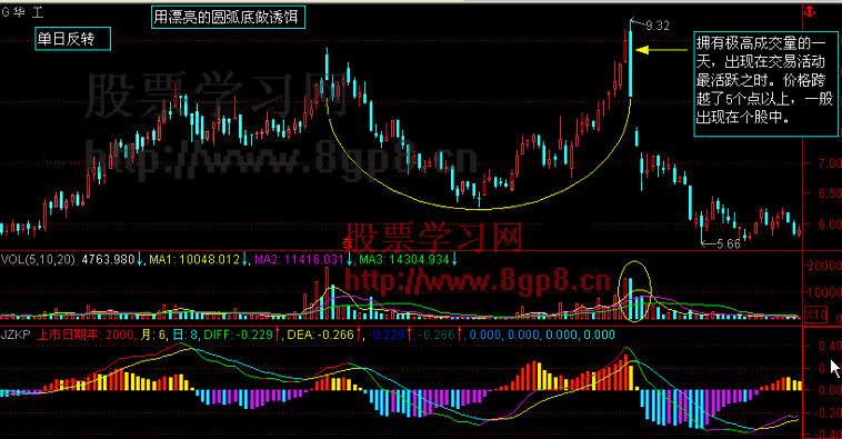 (1)单日反转当天,成交量突然大增,而价位的波动幅度很大,两者较平时都明显增大。如果成交量不高或全日价格波幅不大,型态就不能确认。