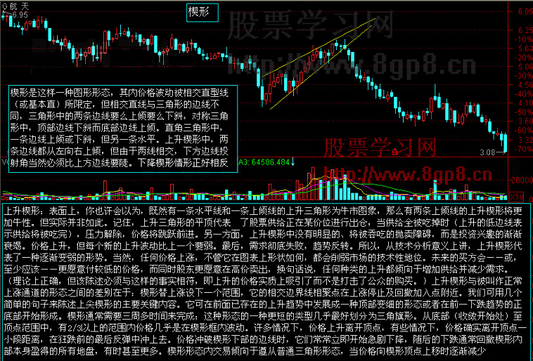 上升楔型指股价经过一次下跌后有强烈技术性反弹,价格升至一定水平又掉头下落,但回落点转前次为高,又上升至新高点比上次反弹点高,又回落形成一浪高一浪之势,把短期高点相连,短期低点相连形成一条向上倾斜直线,下面一条则较为陡峭 (文章来源:股票学习网www.8gp 8.cn)