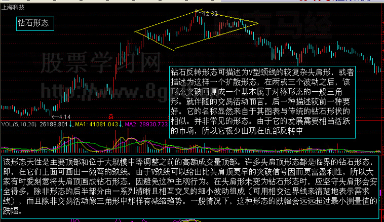 菱形又称为钻石形,是喇叭形、对称三角形、头肩顶的综合体。形态犹如钻石或平行四边形,其颈线为V字状。左半部类似于喇叭形,右半部类似于对称三角形,喇叭形确定之后趋势就是下跌,而对称三角形又使下跌暂时推迟,但终究没有摆脱下跌的命运,而喇叭形与对称三角形结合,成为错综复杂的菱形。与喇叭形相比,其更具向下的意愿。(文章来源:股票学习网www.8gp)8.cn)
