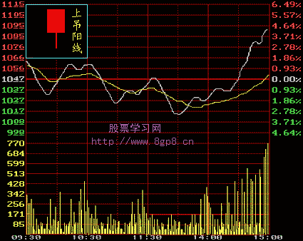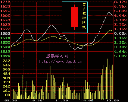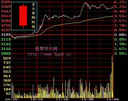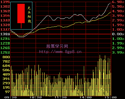 光头阳线若出现在低价位区域,在分时走势图上表现为股价探底后逐浪走高且成交量同时放大,预示为一轮上升行情的开始。如果出现在上升行情途中,表明后市继续看好。
