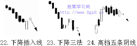 如何看K线图之卖出信号(图)(8) 收集:中国股票市场经济分析网 22、下降插入线 持续下降阴线中,出现一开低走高的阳线,为卖出时机,行情必将持续下跌。 23、下降三法 在行情持续下跌中,出现一条大阴线,隔天起却又连现三根小阳线,这并不代表筑底完成,接下来若再出现一条大阴线,则为做空时机,价格必将持续往下探底。 24、高档五条阴线 价格涨幅已高,线路图出现五条连续阴线,显示行情进入盘局,此时若成交量畏缩,更可确信行情不妙。 【发表评论】【加入收藏】【告诉好友】【打印此文】【关闭窗口】 相关内容 上一篇教程: K线理论初级(1) 下一篇教程: 如何看K线图之卖出信号(图)(7)