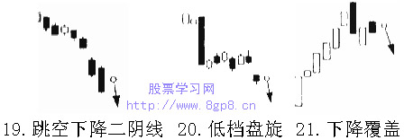 如何看K线图之卖出信号(图)(7) 收集:中国股票市场经济分析网 19、跳空下降二阴线 在下降的行情中又出现跳空下降的连续二条阴线,这是暴跌的前兆。通常在两条阴线出现之前,会有一小段反弹行情,但若反弹物力,连续出现阴线时,表示买盘大崩盘,行情将继续往下探底。 20、低档盘旋 通常整理时间在六日至十一日之间,若接下来出现跳空阴线,则为大跌的起步,也就是说前段的盘整只不过是中段的盘正罢了,行情将持续回档整理。 21、下降覆盖 在高档震荡行情中,出现一条包容大阴线,隔日牵出一条下降阳线,接下来又出现覆盖线,则暗示行情已到达天价价位,此时为脱手线。 【发表评论】【加入收藏】【告诉好友】【打印此文】【关闭窗口】 相关内容 上一篇教程: 如何看K线图之卖出信号(图)(8) 下一篇教程: 如何看K线图之卖出信号(图)(6)