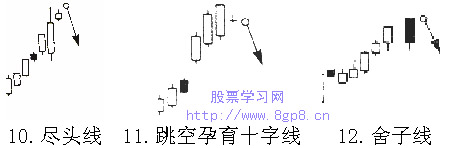 如何看K线图之卖出信号(图)(4) 收集:中国股票市场经济分析网 10、 尽头线 持续涨升的行情一旦出现此图形,表示上涨力道即将不足,行情将回档盘整,投资人宜先行获利了结。这也是一种“障眼线”,小阳线并没有超越前一日的最高点,证明上涨乏力,行情下跌。 11、跳空孕育十字线 当价格跳空上涨后拉出三根大阳线,随后又出现一条十字线,代表涨幅过大,买盘不愿追高,持仓者纷纷杀出,市场价格将暴跌。 12、舍子线 行情跳空上涨形成一条十字线,隔日却又跳空拉出一根阴线,暗示行情即将暴跌。此时价格涨幅已经相当大,无力再往上冲,以致跳空而下,为卖出信号,在此情况下,成交量值往往也会随之减少。 【发表评论】【加入收藏】【告诉好友】【打印此文】【关闭窗口】 相关内容 上一篇教程: 如何看K线图之卖出信号(图)(5) 下一篇教程: 如何看K线图之卖出信号(图)(3)